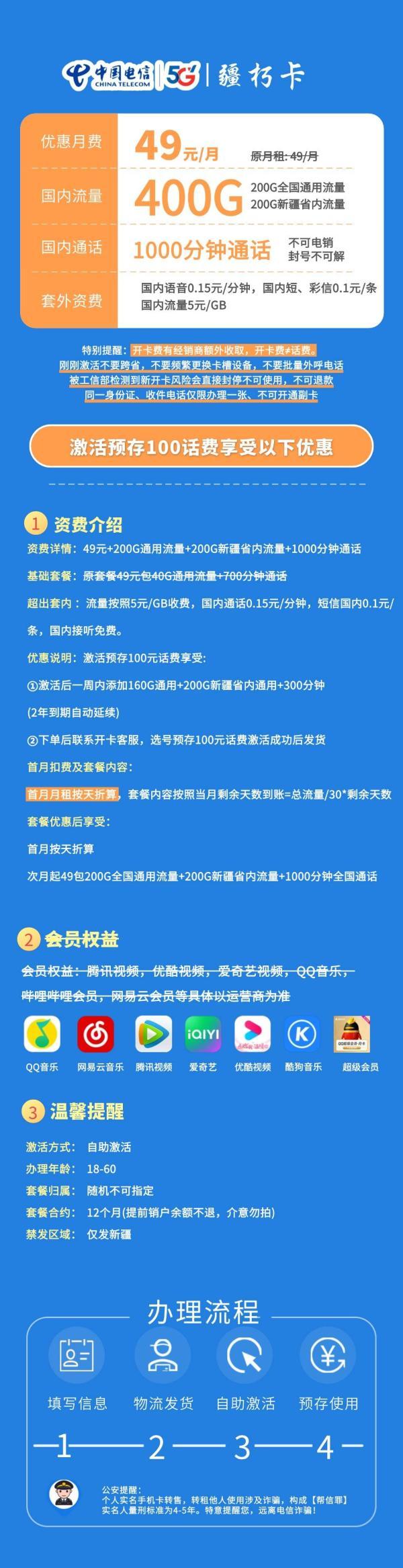 - 次月起,直接享受49元=200G全国通用+200G新疆省内+1000分钟通话!