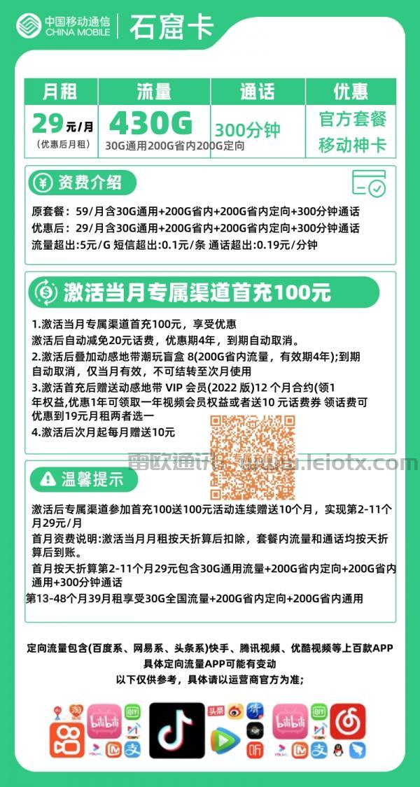 中国移动石窟卡(移动神卡)资费详解:430G流量+300分钟通话,优惠后低至19元/月