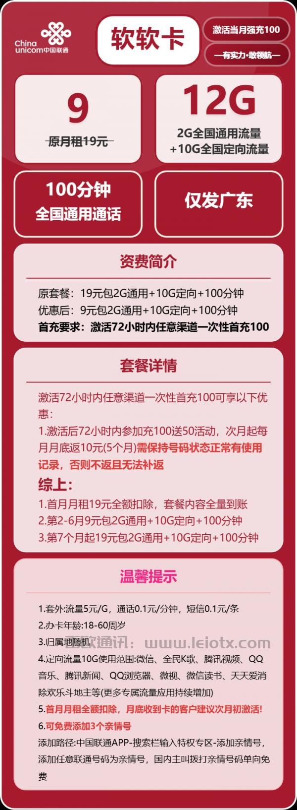 对于广东地区想找高性价比手机卡的用户来说,近期上线的联通软软卡堪称“刚需福利”——原19元月租套餐,通过首充优惠可直降10元,第2-6月仅需9元就能拿下12G流量(2G通用+10G定向)+100分钟全国通话,尤其适合学生党、通勤族和轻度用卡人群。今天就从套餐亮点、优惠规则到使用注意事项,给大家做一篇详细拆解,帮你快速判断是否适合自己。