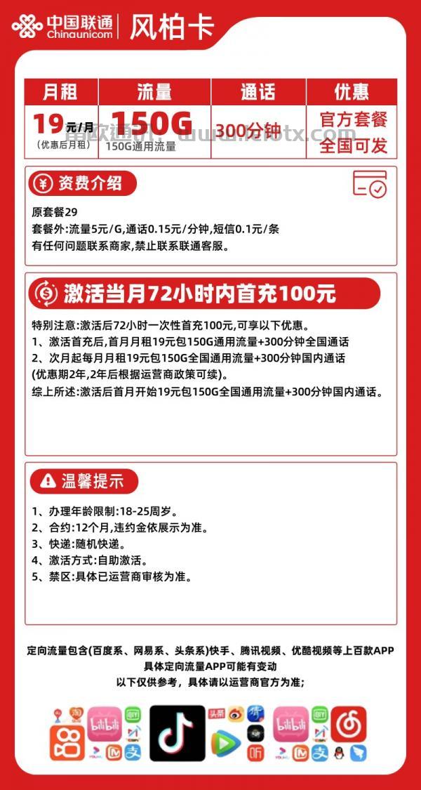 中国联通风柏卡重磅上线!19元享150G流量+300分钟通话,年轻人专属超值套餐!