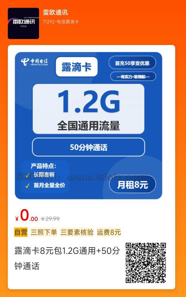 露滴卡原套餐为8元/月,含1.2G全国通用流量+50分钟全国通话,接听免费,送来电显示,资费清晰,适合低用量用户。