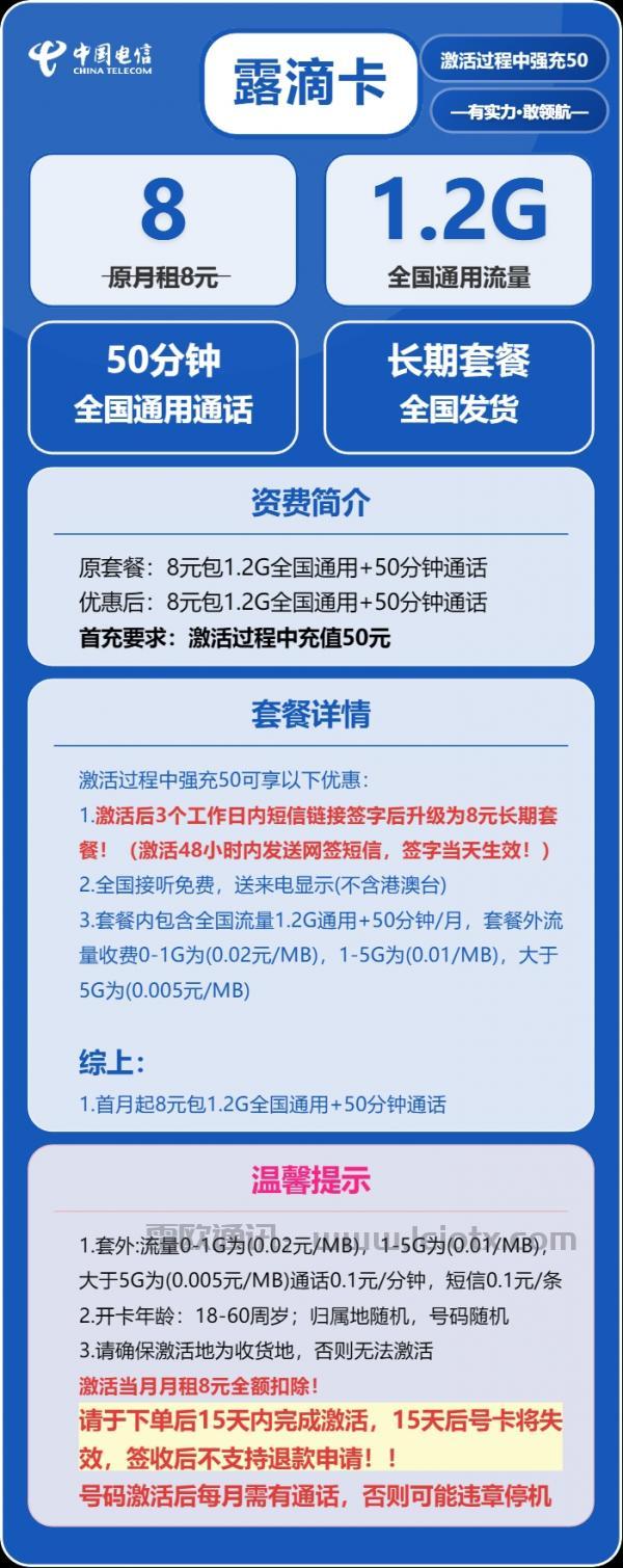 露滴卡8元长期套餐靠谱吗?激活强充50元真相揭秘
