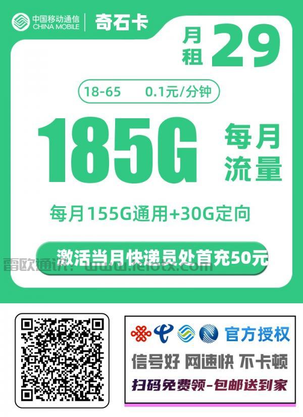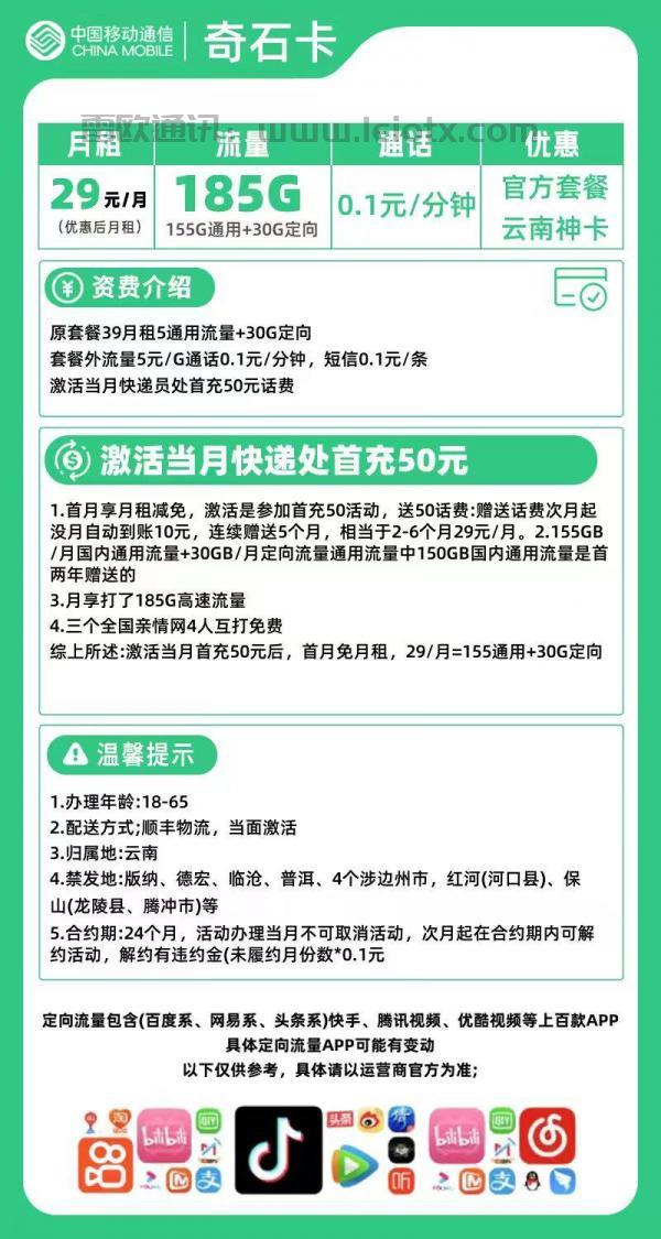 中国移动云南神卡——奇石卡185G大流量+低月租,限时优惠!