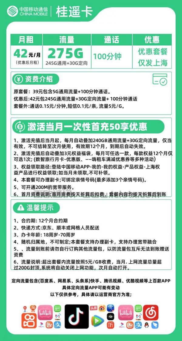 近日,中国移动在上海地区推出全新大流量套餐——桂遥卡,以42元/月的优惠价格,提供275G超大流量+100分钟通话,引发用户关注。该卡专为高流量需求用户设计,性价比突出,适合日常刷视频、追剧、办公上网人群。