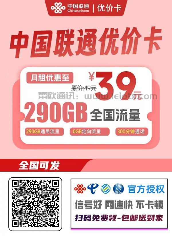 中国联通优价卡:39元享290G通用流量+300分钟,超值套餐详解