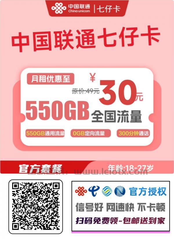 中国联通七仔卡套餐详解:30元/月550G通用流量+300分钟+会员低月租享大流量,学生党与流量控福音!