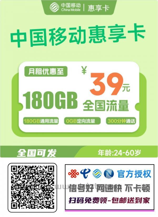 还在为高额流量费发愁?中国移动惠享卡震撼来袭!月租仅39元,享180G通用流量+300分钟通话,超值优惠限时办理,助您畅享通信自由!