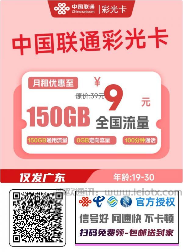 中国联通彩光卡(广东专享):9元月租+150GB大流量时代刚需高性价比套餐!联通彩光卡为广东用户定制,首充100元享多重长期优惠,性价比拉满。