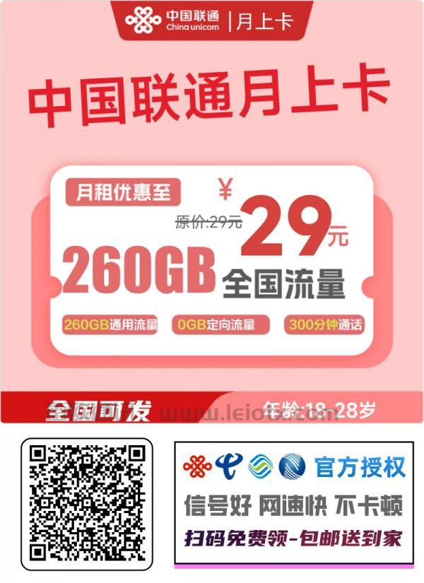 中国联通推出超值月上卡套餐,月租仅需29元,即可享受260GB全国通用流量和300分钟通话。