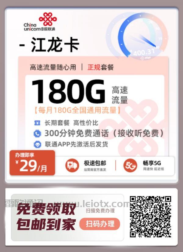 联通江龙卡重磅上线!29元/月享180G通用流量+300分钟通话,长期优惠太香了!