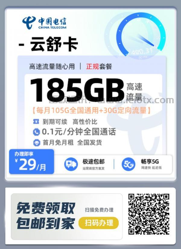 电信云舒卡上线!首月免租,29元享185G大流量,真香!