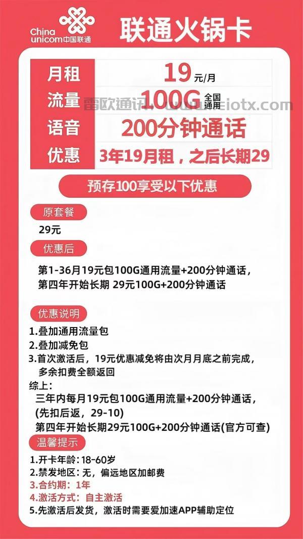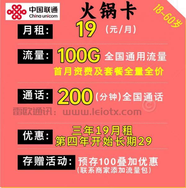 中国联通重磅推出联通火锅卡,月租仅19元,每月畅享100G全国通用流量+200分钟通话!前3年低价锁定,第4年起仅29元长期延续,预存100元即可激活优惠,性价比拉满,速来抢办!