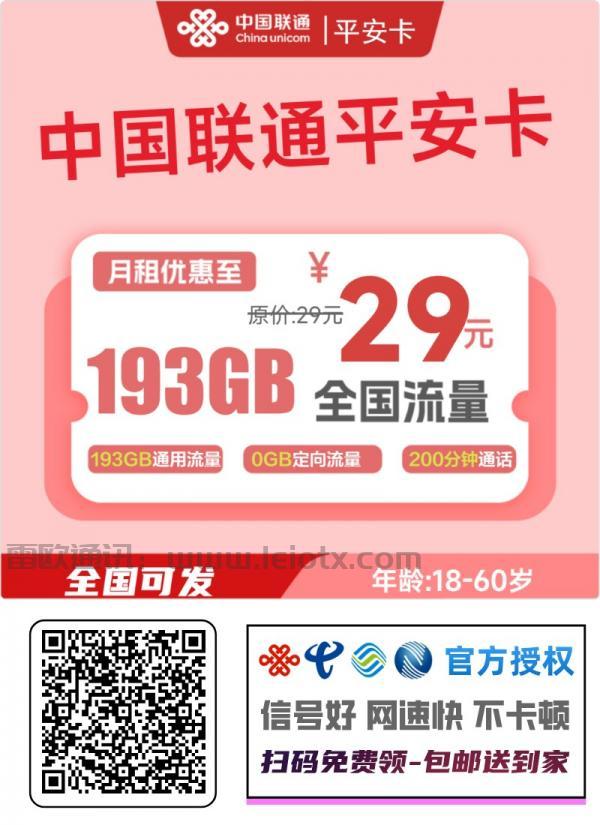 中国联通平安卡!29元享193G+200分钟通话,自动续约长期神卡!