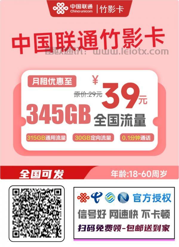 中国联通竹影卡怎么样?39元享315G大流量+30G定向,24个月自动续约+月返3元!