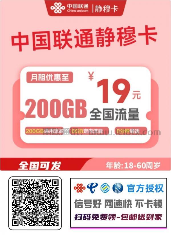 中国联通全新推出静穆卡,专为“纯流量用户”量身打造!月租仅19元,畅享200G全国通用流量,连续享受3年超长优惠期!激活首充100元即可锁定低价,3年后自动转为长期29元10G套餐,无语音、无短信功能,专注流量体验,拒绝冗余消费,真正实现“轻量化通信”!全国可发,限时开放办理,速来抢办!