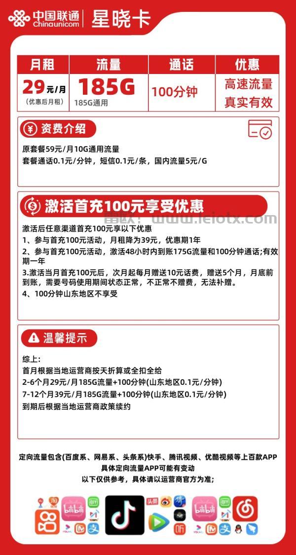 联通星晓卡怎么样29月租185g每月通用大流量归属地即收货省份