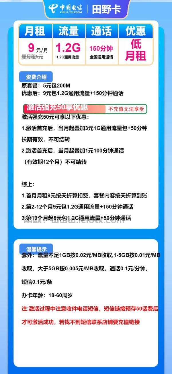 电信田野卡怎么样?每月仅需要9元就可以享受1.2g通用流量+150分钟通话首充五十就可以享受优惠。下面我们来一起看看套餐详细介绍吧!